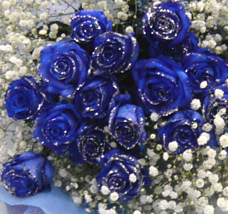 きらきらするラメ ブルーローズかすみ草を合わせ雪の中のバラのよう・・・