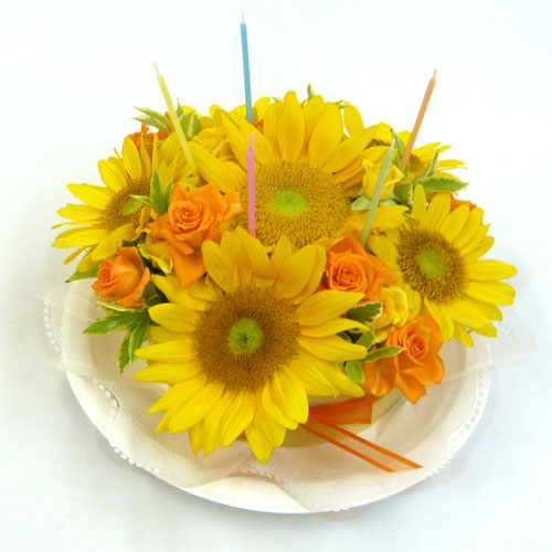 ヒマワリ・ミニバラ・黄色の小花・グリーン等でフラワーケーキをつくります。 |