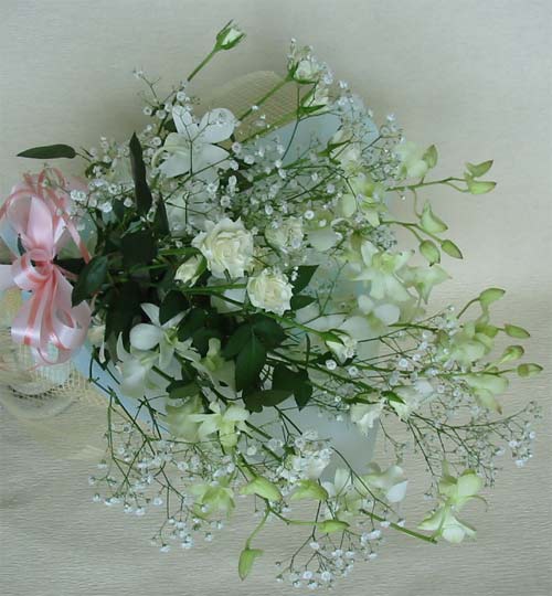 | デンファレ、白SPバラ、カスミソウ使用 |